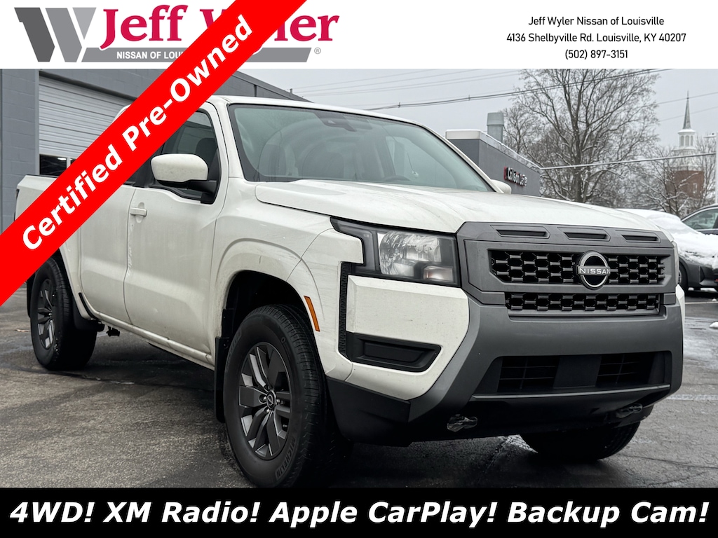 Jeff Wyler Nissan of Louisville is honored to offer this good-looking 2025 Nissan Frontier SV in Glacier White. ** BALANCE OF FACTORY WARRANTY **, ** NISSAN CERTIFIED PRE-OWNED **, ** ONE-OWNER CARFAX **, ** CLEAN CARFAX REPORT **, ** BLUETOOTH **, ** BACKUP CAMERA **, ** PUSH-BUTTON START **, ** 6-CYLINDER ENGINE **, ** PREVIOUS NISSAN COURTESY VEHICLE **, ** EXCELLENT SERVICE HISTORY **, ** LOCALLY OWNED **, and ** HOME DELIVERY OPTIONS! ** Telematics Delete Package (H03) (NissanConnect Services & Wi-Fi Hotspot Delete), Nissan Certified Pre-Owned Certified, 4WD, 17" Alloy Wheels, 3.692 Axle Ratio, 4-Wheel Disc Brakes, 6 Speakers, ABS brakes, Air Conditioning, Alloy wheels, AM/FM radio: SiriusXM, Anti-whiplash front head restraints, Auto High-beam Headlights, Blind Spot Warning, Brake assist, Bumpers: body-color, Carpeted Floor Mats, Delay-off headlights, Driver door bin, Driver vanity mirror, Dual front impact airbags, Dual front side impact airbags, Electronic Stability Control, Emergency communication system, Front anti-roll bar, Front Bucket Seats, Front Center Armrest, Front reading lights, Front wheel independent suspension, Fully automatic headlights, Illuminated entry, Knee airbag, Low tire pressure warning, Occupant sensing airbag, Overhead airbag, Overhead console, Panic alarm, Passenger door bin, Passenger vanity mirror, Power door mirrors, Power driver seat, Power steering, Power windows, Premium Cloth Seat Trim, Radio data system, Radio: SXM/AM/FM/AUX/USB Audio System, Rear anti-roll bar, Rear seat center armrest, Rear side impact airbag, Rear step bumper, Remote keyless entry, Security system, Sliding Window Delete, Speed control, Speed-sensing steering, Splash Guards (DISC), Split folding rear seat, Steering wheel mounted audio controls, Tachometer, Telescoping steering wheel, Tilt steering wheel, Traction control, Trip computer, Variably intermittent wipers, Voltmeter, and Wireless Apple CarPlay/Wireless Android Auto Our PRE-OWNED vehicles are put through a rigorous 167- POINT QUALITY ASSURANCE INSPECTION along with an average amount of over $1,400.00 SPENT to recondition each vehicle so we can be sure to deliver you the highest quality vehicle like you deserve! ***ONLINE PRICE DOES NOT INCLUDE WYLER FAMILY FIRST PACKAGE*** Stop by 4136 Shelbyville Road to see for yourself, or give us a call @ 502-897-3151 to schedule your test drive! ** BALANCE OF FACTORY WARRANTY **, ** NISSAN CERTIFIED PRE-OWNED **, ** ONE-OWNER CARFAX **, ** CLEAN CARFAX REPORT **, ** BLUETOOTH **, ** BACKUP CAMERA **, ** PUSH-BUTTON START **, ** 6-CYLINDER ENGINE **, ** PREVIOUS NISSAN COURTESY VEHICLE **, ** EXCELLENT SERVICE HISTORY **, ** LOCALLY OWNED **, 4WD.