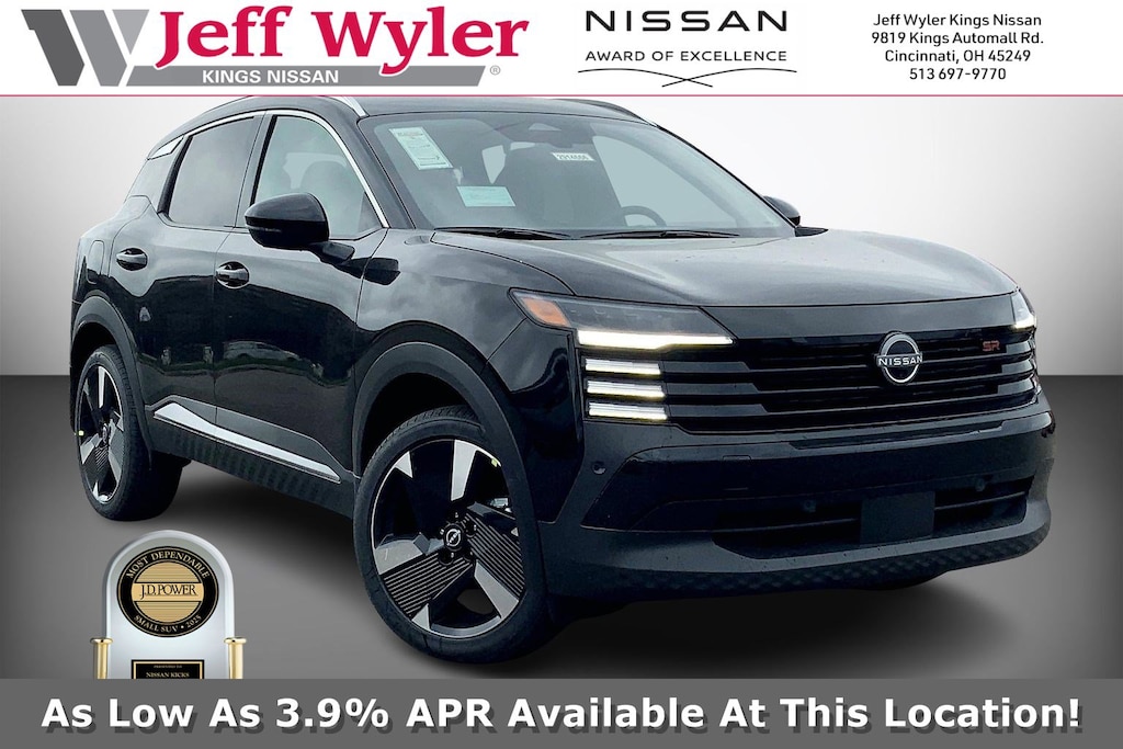 $4,852 off MSRP! Jeff Wyler Kings Nissan is proud to offer this outstanding 2025 Nissan Kicks SR in Super Black. Well equipped with: SR Premium Package (Bose 10 -Speaker Audio, Driver Seat-Mounted Supplemental Air Bag, Heated Front Seats, Heated Steering Wheel, Panoramic Moonroof, Rain Sensing Wipers, and Remote Engine Start), 17" Alloy Wheels, 19" Alloy Wheels, 4-Wheel Disc Brakes, 6 Speakers, ABS brakes, Air Conditioning, Alloy wheels, AM/FM radio: Sirius, Auto High-beam Headlights, Automatic temperature control, Brake assist, Bumpers: body-color, Carpeted Floor Mats, Delay-off headlights, Driver door bin, Driver vanity mirror, Dual front impact airbags, Dual front side impact airbags, Electronic Stability Control, Four wheel independent suspension, Front anti-roll bar, Front Bucket Seats, Front Center Armrest, Front reading lights, Fully automatic headlights, Heated door mirrors, Illuminated entry, Knee airbag, Leather Shift Knob, Leather steering wheel, Low tire pressure warning, Occupant sensing airbag, Outside temperature display, Overhead airbag, Overhead console, Panic alarm, Passenger door bin, Passenger vanity mirror, Power door mirrors, Power steering, Power windows, Radio data system, Radio: AM/FM Audio System, Rear anti-roll bar, Rear reading lights, Rear seat center armrest, Rear side impact airbag, Rear window defroster, Rear window wiper, Remote keyless entry, Security system, Speed control, Speed-sensing steering, Splash Guards, Split folding rear seat, Spoiler, Sport Cloth/Leatherette Seat Trim, Sport steering wheel, Steering wheel mounted audio controls, Tachometer, Telescoping steering wheel, Tilt steering wheel, Traction control, Trip computer, Turn signal indicator mirrors, Variably intermittent wipers, and Wireless Apple CarPlay/Wireless Android Auto. 27/34 City/Highway MPGWyler Family First Package Includes: NanoCure Appearance Protection: Exterior & Interior Chemical Sealant Applied to Protect Against Environmental Hazards (7 Year Warranty Coverage). Pulse- Rear end Collision Avoidance System Theft Deterrent Strategy gives you 5 Years of Coverage against vehicle Theft, Offering up to a $5,000 benefit. Used vehicles 10 years of age or newer with less than 100,000 miles are eligible for the Wyler Assurance Program, but eligible vehicles must pass our reconditioning process and multi-point inspection. Provided the vehicle passes inspection, vehicles will be eligible for the 6 month/6,000 mile limited warranty. The 6 month/6,000 mile limited warranty is NOT available on AS-IS vehicles, wholesale vehicles, lease buyback/pass-thru vehicles or un-inspected vehicles. Note that this program can also apply to vehicles where the remaining factory coverage is less than 6 months or 6,000 miles. Please check the Federal Trade Commission (FTC) Buyers guide on the vehicle for full details as to whether or not warranty coverage may apply. Contact Dealer for additional details. The Wyler Assurance 6 month/6,000 Mile limited warranty ends 6 months from the date of the Retail Purchase Agreement (BUYERS ORDER) or when the vehicle's odometer registers 6,000 additional miles to the mileage listed on the BUYERS ORDER, whichever comes first. Your Deductible - The warranty holder on your contract pays the first $100 of each covered repair. Price includes: $1000 - Nissan MY25 New Kicks (SV and SR) Retail/Lease Bonus Cash. Exp. 01/05/2026 $500 - Nissan MWR MY25 New Kicks Bonus Cash - December. Exp. 01/05/2026