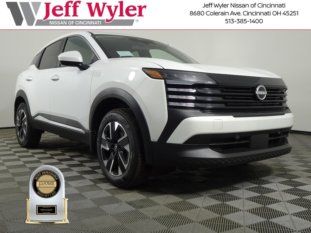 $5,354 off MSRP! Priced below KBB Fair Purchase Price! Aspen White Tricoat 2025 Nissan Kicks SV AWD CVT with Xtronic Jeff Wyler Nissan of Cincinnati is delighted to offer this terrific 2025 Nissan Kicks SV in Aspen White Tricoat. Well equipped with: 17" Alloy Wheels, 4 Speakers, 4-Wheel Disc Brakes, ABS brakes, Air Conditioning, Alloy wheels, AM/FM radio: Sirius, Auto High-beam Headlights, Blind Spot Warning, Brake assist, Bumpers: body-color, Carpeted Floor Mats, Cloth Seat Trim, Driver door bin, Driver vanity mirror, Dual front impact airbags, Dual front side impact airbags, Electronic Stability Control, Four wheel independent suspension, Front anti-roll bar, Front Bucket Seats, Front Center Armrest, Front reading lights, Fully automatic headlights, Heated door mirrors, Illuminated entry, Knee airbag, Low tire pressure warning, Occupant sensing airbag, Outside temperature display, Overhead airbag, Panic alarm, Passenger door bin, Passenger vanity mirror, Power door mirrors, Power steering, Power windows, Premium Paint, Radio data system, Radio: AM/FM Audio System, Rear anti-roll bar, Rear Parking Sensors, Rear reading lights, Rear side impact airbag, Rear window defroster, Rear window wiper, Remote keyless entry, Security system, Speed control, Speed-sensing steering, Splash Guards, Split folding rear seat, Spoiler, Sport steering wheel, Steering wheel mounted audio controls, Tachometer, Telescoping steering wheel, Tilt steering wheel, Traction control, Trip computer, Variably intermittent wipers, and Wireless Apple CarPlay/Wireless Android Auto. 2.0L DOHC27/34 City/Highway MPGWyler Family First Package Includes: NanoCure Appearance Protection: Exterior & Interior Chemical Sealant Applied to Protect Against Environmental Hazards (7 Year Warranty Coverage). Pulse- Rear end Collision Avoidance System Theft Deterrent Strategy gives you 5 Years of Coverage against vehicle Theft, Offering up to a $5,000 benefit. Price includes: $1000 - Nissan MY25 New Kicks (SV and SR) Retail/Lease Bonus Cash. Exp. 01/05/2026 $500 - Nissan MWR MY25 New Kicks Bonus Cash - December. Exp. 01/05/2026