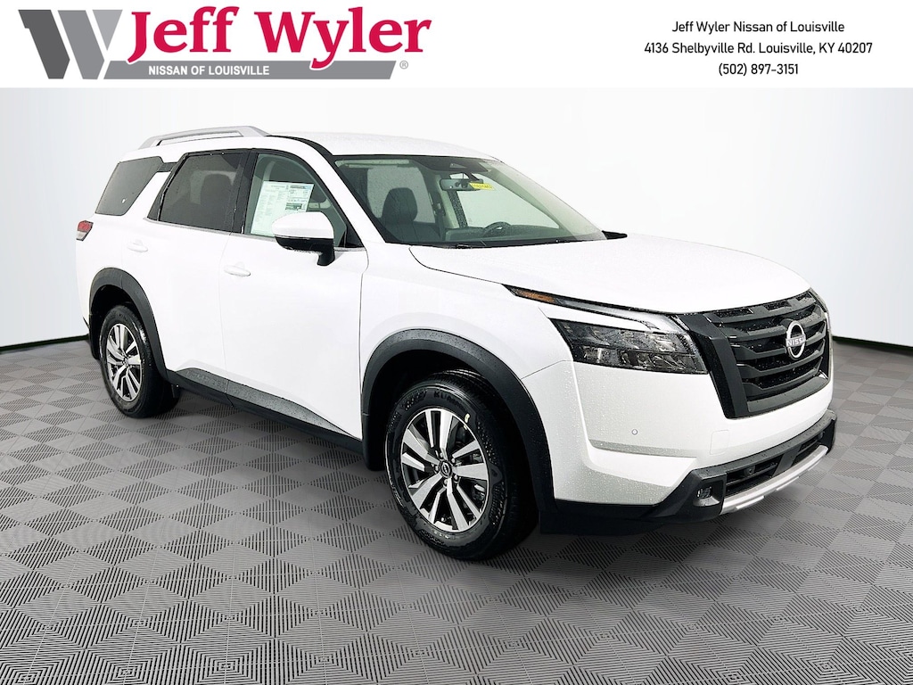 Recent Arrival! Jeff Wyler Nissan of Louisville is delighted to offer this beautiful-looking 2025 Nissan Pathfinder SL in Everest White Pearl Tricoat. Well equipped with: 4WD, 3rd row seats: bench, 4-Wheel Disc Brakes, 6 Speakers, ABS brakes, Air Conditioning, Alloy wheels, AM/FM radio: SiriusXM, Auto High-beam Headlights, Auto-dimming Rear-View mirror, Automatic temperature control, Brake assist, Bumpers: body-color, Delay-off headlights, Driver door bin, Driver vanity mirror, Dual front impact airbags, Dual front side impact airbags, Electronic Stability Control, Emergency communication system, Exterior Parking Camera Rear, Four wheel independent suspension, Front anti-roll bar, Front Bucket Seats, Front Center Armrest, Front dual zone A/C, Front reading lights, Fully automatic headlights, Garage door transmitter: HomeLink, Heated door mirrors, Heated Front Bucket Seats, Heated front seats, Heated steering wheel, Illuminated entry, Knee airbag, Leather steering wheel, Leather-Appointed Seating Surfaces, Low tire pressure warning, Navigation system: NissanConnect with Navigation and Services, NissanConnect featuring Apple CarPlay and Android Auto, NissanConnect w/Navigation & Services, Occupant sensing airbag, Outside temperature display, Overhead airbag, Overhead console, Panic alarm, Passenger door bin, Passenger vanity mirror, Power door mirrors, Power driver seat, Power Liftgate, Power passenger seat, Power steering, Power windows, Radio data system, Radio: AM/FM Audio System, Rear air conditioning, Rear anti-roll bar, Rear reading lights, Rear seat center armrest, Rear side impact airbag, Rear window defroster, Rear window wiper, Reclining 3rd row seat, Remote keyless entry, Security system, Speed control, Speed-sensing steering, Split folding rear seat, Spoiler, Steering wheel mounted audio controls, Tachometer, Telescoping steering wheel, Tilt steering wheel, Traction control, Trip computer, Turn signal indicator mirrors, Variably intermittent wipers, and Wheels: 18" x 8J Machined Alloy.2025 Nissan Pathfinder SL Everest White Pearl Tricoat Wyler Family First Package Includes: NanoCure Appearance Protection: Exterior & Interior Chemical Sealant Applied to Protect Against Environmental Hazards (7 Year Warranty Coverage). Pulse- Rear end Collision Avoidance System Theft Deterrent Strategy gives you 5 Years of Coverage against vehicle Theft, Offering up to a $5,000 benefit. 4WD. Customer's May Not Qualify for All Rebates. Prices Do Not Include Tax, License. $5000 - Nissan Customer Cash. Exp. 12/01/2025