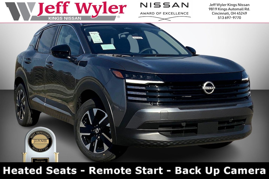 $3,408 off MSRP! Jeff Wyler Kings Nissan is honored to offer this attractive 2026 Nissan Kicks SV in Gun Metallic. Well equipped with: Cold Weather Package (Heated Front Seats, Heated Mirrors, and Rear Floor Heater Ducts), SV Premium Package (Illuminated Driver & Passenger Sun Visors, Panoramic Moonroof, and Sunglass Holder), 4 Speakers, 4-Wheel Disc Brakes, ABS brakes, Air Conditioning, AM/FM radio, Auto High-beam Headlights, Automatic temperature control, Blind Spot Warning, Brake assist, Bumpers: body-color, Carpeted Floor Mats & Underfloor Protector, Cloth Seat Trim, Driver door bin, Driver vanity mirror, Dual front impact airbags, Dual front side impact airbags, Electronic Stability Control, Emergency communication system, Exterior Parking Camera Rear, Front anti-roll bar, Front Bucket Seats, Front Center Armrest, Front reading lights, Front wheel independent suspension, Fully automatic headlights, Illuminated entry, Knee airbag, Low tire pressure warning, NissanConnect featuring Apple CarPlay and Android Auto, Occupant sensing airbag, Outside temperature display, Overhead airbag, Panic alarm, Panoramic Headliner Illumination, Passenger door bin, Passenger vanity mirror, Power door mirrors, Power steering, Power windows, Radio data system, Radio: AM/FM/SiriusXM Audio System, Rear anti-roll bar, Rear reading lights, Rear side impact airbag, Rear window defroster, Rear window wiper, Remote keyless entry, Security system, Speed control, Speed-sensing steering, Splash Guards, Split folding rear seat, Spoiler, Sport steering wheel, Steering wheel mounted audio controls, Tachometer, Telescoping steering wheel, Tilt steering wheel, Traction control, Trip computer, Variably intermittent wipers, and Wheels: 17" Steel Flex w/Full Covers. 28/35 City/Highway MPGWyler Family First Package Includes: NanoCure Appearance Protection: Exterior & Interior Chemical Sealant Applied to Protect Against Environmental Hazards (7 Year Warranty Coverage). Pulse- Rear end Collision Avoidance System Theft Deterrent Strategy gives you 5 Years of Coverage against vehicle Theft, Offering up to a $5,000 benefit. Used vehicles 10 years of age or newer with less than 100,000 miles are eligible for the Wyler Assurance Program, but eligible vehicles must pass our reconditioning process and multi-point inspection. Provided the vehicle passes inspection, vehicles will be eligible for the 6 month/6,000 mile limited warranty. The 6 month/6,000 mile limited warranty is NOT available on AS-IS vehicles, wholesale vehicles, lease buyback/pass-thru vehicles or un-inspected vehicles. Note that this program can also apply to vehicles where the remaining factory coverage is less than 6 months or 6,000 miles. Please check the Federal Trade Commission (FTC) Buyers guide on the vehicle for full details as to whether or not warranty coverage may apply. Contact Dealer for additional details. The Wyler Assurance 6 month/6,000 Mile limited warranty ends 6 months from the date of the Retail Purchase Agreement (BUYERS ORDER) or when the vehicle's odometer registers 6,000 additional miles to the mileage listed on the BUYERS ORDER, whichever comes first. Your Deductible - The warranty holder on your contract pays the first $100 of each covered repair. Price includes: $1000 - Nissan Customer Cash. Exp. 02/02/2026 $500 - Nissan MWR MY26 Kicks Bonus Cash - January . Exp. 02/02/2026