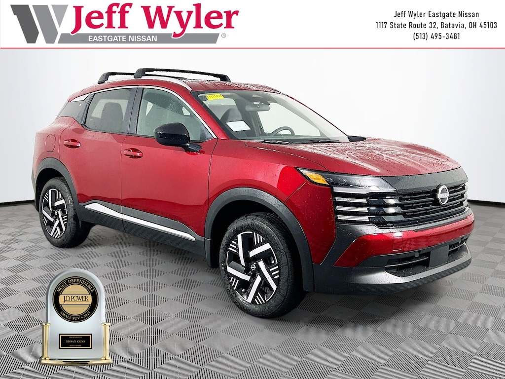 Scarlet Ember Tintcoat 2026 Nissan Kicks SV 2.0L DOHC FWD CVT with Xtronic 28/35 City/Highway MPG Jeff Wyler Eastgate Auto Mall is delighted to offer this attractive 2026 Nissan Kicks SV in Scarlet Ember Tintcoat. Well equipped with: Cold Weather Package (Heated Front Seats, Heated Mirrors, and Rear Floor Heater Ducts), SV Premium Package (Illuminated Driver & Passenger Sun Visors, Panoramic Moonroof, and Sunglass Holder), 4 Speakers, 4-Wheel Disc Brakes, ABS brakes, Air Conditioning, AM/FM radio, Auto High-beam Headlights, Automatic temperature control, Blind Spot Warning, Brake assist, Bumpers: body-color, Carpeted Floor Mats & Underfloor Protector, Cloth Seat Trim, Crossbars, Driver door bin, Driver vanity mirror, Dual front impact airbags, Dual front side impact airbags, Electronic Stability Control, Emergency communication system, Exterior Parking Camera Rear, Front anti-roll bar, Front Bucket Seats, Front Center Armrest, Front reading lights, Front wheel independent suspension, Fully automatic headlights, Illuminated entry, Knee airbag, Low tire pressure warning, NissanConnect featuring Apple CarPlay and Android Auto, Occupant sensing airbag, Outside temperature display, Overhead airbag, Panic alarm, Passenger door bin, Passenger vanity mirror, Power door mirrors, Power steering, Power windows, Premium Paint, Radio data system, Radio: AM/FM/SiriusXM Audio System, Rear anti-roll bar, Rear reading lights, Rear side impact airbag, Rear window defroster, Rear window wiper, Remote keyless entry, Security system, Speed control, Speed-sensing steering, Splash Guards, Split folding rear seat, Spoiler, Sport steering wheel, Steering wheel mounted audio controls, Tachometer, Telescoping steering wheel, Tilt steering wheel, Traction control, Trip computer, Variably intermittent wipers, and Wheels: 17" Steel Flex w/Full Covers. 28/35 City/Highway MPG Price includes: $1000 - Nissan Customer Cash. Exp. 01/05/2026 $500 - Nissan MWR MY26 Kicks Bonus Cash - December. Exp. 01/05/2026