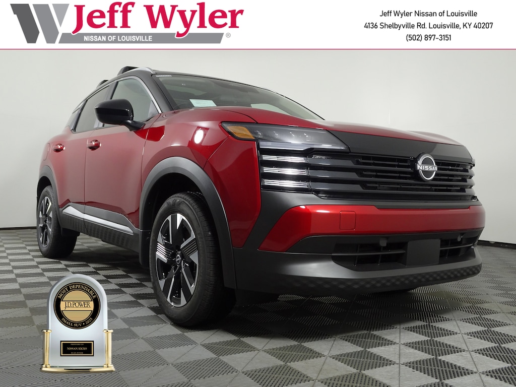 Recent Arrival! Jeff Wyler Nissan of Louisville is excited to offer this great 2026 Nissan Kicks SV in Black. Well equipped with: Cold Weather Package (Heated Front Seats, Heated Mirrors, and Rear Floor Heater Ducts), SV Premium Package (Illuminated Driver & Passenger Sun Visors, Panoramic Moonroof, and Sunglass Holder), 17" Alloy Wheels, 2-Tone Premium Paint, 4 Speakers, 4-Wheel Disc Brakes, ABS brakes, Air Conditioning, Alloy wheels, AM/FM radio, Auto High-beam Headlights, Automatic temperature control, AWD Cargo Mat, Blind Spot Warning, Brake assist, Bumpers: body-color, Carpeted Floor Mats, Cloth Seat Trim, Crossbars, Driver door bin, Driver vanity mirror, Dual front impact airbags, Dual front side impact airbags, Electronic Stability Control, Emergency communication system, Exterior Parking Camera Rear, Four wheel independent suspension, Front anti-roll bar, Front Bucket Seats, Front Center Armrest, Front reading lights, Fully automatic headlights, Illuminated entry, Knee airbag, Low tire pressure warning, NissanConnect featuring Apple CarPlay and Android Auto, Occupant sensing airbag, Outside temperature display, Overhead airbag, Panic alarm, Passenger door bin, Passenger vanity mirror, Power door mirrors, Power steering, Power windows, Radio data system, Radio: AM/FM/SiriusXM Audio System, Rear anti-roll bar, Rear reading lights, Rear side impact airbag, Rear window defroster, Rear window wiper, Remote keyless entry, Security system, Speed control, Speed-sensing steering, Splash Guards, Split folding rear seat, Spoiler, Sport steering wheel, Steering wheel mounted audio controls, Tachometer, Telescoping steering wheel, Tilt steering wheel, Traction control, Trip computer, and Variably intermittent wipers.2026 Nissan Kicks SV Black Wyler Family First Package Includes: NanoCure Appearance Protection: Exterior & Interior Chemical Sealant Applied to Protect Against Environmental Hazards (7 Year Warranty Coverage). Pulse- Rear end Collision Avoidance System Theft Deterrent Strategy gives you 5 Years of Coverage against vehicle Theft, Offering up to a $5,000 benefit. Customer's May Not Qualify for All Rebates. Prices Do Not Include Tax, License. $1000 - Nissan Customer Cash. Exp. 01/05/2026 $500 - Nissan MWR MY26 Kicks Bonus Cash - December. Exp. 01/05/2026