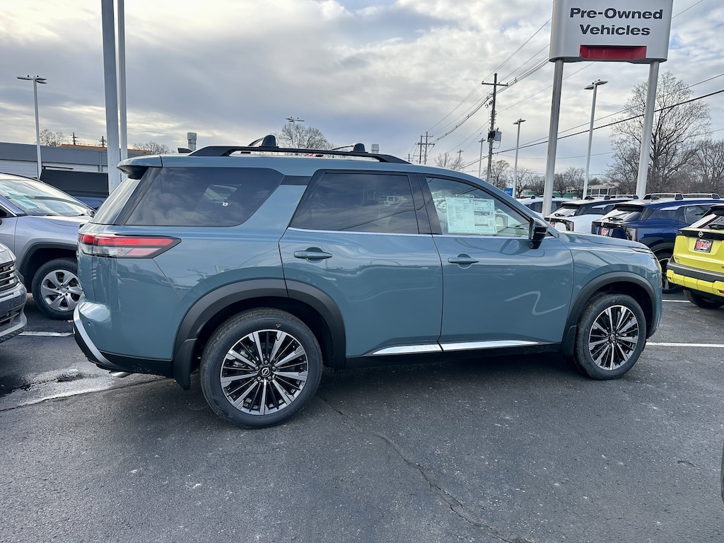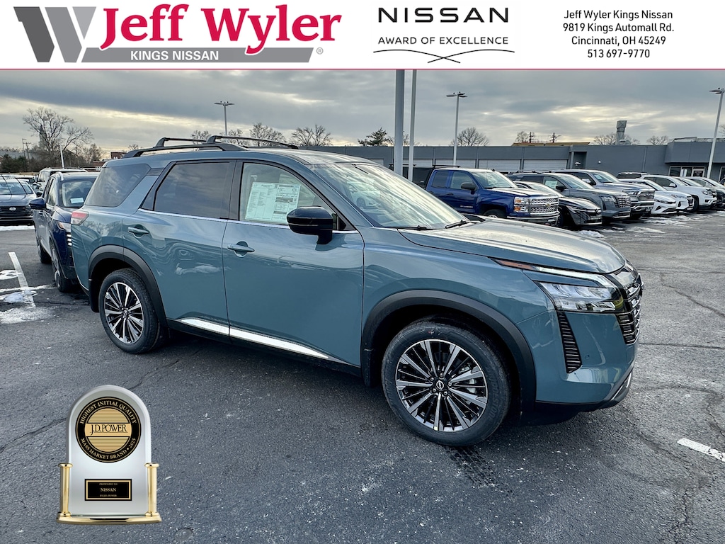 Jeff Wyler Kings Nissan is honored to offer this great-looking 2026 Nissan Pathfinder Platinum in Baltic Teal. Well equipped with: Cargo Package (Cargo Area Protector, Cargo Net, and First Aid), 4WD, 13 Speakers, 3rd row seats: bench, 4-Piece Black Splash Guards, 4-Wheel Disc Brakes, ABS brakes, Air Conditioning, Alloy wheels, AM/FM radio: SiriusXM w/360L, Auto High-beam Headlights, Auto tilt-away steering wheel, Auto-dimming Rear-View mirror, Automatic temperature control, Bench Seat Carpeted Floor Mats, Bodyside moldings, Bose Premium Audio System, Brake assist, Bumpers: body-color, Climate Controlled Front Bucket Seats, Cross Bars, Delay-off headlights, Driver door bin, Driver vanity mirror, Dual front impact airbags, Dual front side impact airbags, Electronic Stability Control, Emergency communication system: NissanConnect Services, Four wheel independent suspension, Front anti-roll bar, Front Bucket Seats, Front Center Armrest, Front dual zone A/C, Front reading lights, Fully automatic headlights, Garage door transmitter: HomeLink, Heads-Up Display, Heated door mirrors, Heated front seats, Heated rear seats, Heated steering wheel, Illuminated entry, Knee airbag, Low tire pressure warning, Memory seat, NissanConnect featuring Apple CarPlay and Android Auto, Occupant sensing airbag, Outside temperature display, Overhead airbag, Overhead console, Panic alarm, Passenger door bin, Passenger vanity mirror, Power door mirrors, Power driver seat, Power Liftgate, Power moonroof, Power passenger seat, Power steering, Power windows, Premium Paint, Radio data system, Radio: AM/FM Audio System with NissanConnect, Rain sensing wipers, Rear air conditioning, Rear anti-roll bar, Rear reading lights, Rear seat center armrest, Rear side impact airbag, Rear window defroster, Rear window wiper, Reclining 3rd row seat, Remote keyless entry, Security system, Semi-Aniline Leather-Appointed Seating Surfaces, Speed control, Speed-sensing steering, Speed-Sensitive Wipers, Split folding rear seat, Spoiler, Steering wheel memory, Steering wheel mounted audio controls, Tachometer, Telescoping steering wheel, Tilt steering wheel, Traction control, Trip computer, Turn signal indicator mirrors, Variably intermittent wipers, Ventilated front seats, and Wheels: 20" Machined Alloy.Wyler Family First Package Includes: NanoCure Appearance Protection: Exterior & Interior Chemical Sealant Applied to Protect Against Environmental Hazards (7 Year Warranty Coverage). Pulse- Rear end Collision Avoidance System Theft Deterrent Strategy gives you 5 Years of Coverage against vehicle Theft, Offering up to a $5,000 benefit. Used vehicles 10 years of age or newer with less than 100,000 miles are eligible for the Wyler Assurance Program, but eligible vehicles must pass our reconditioning process and multi-point inspection. Provided the vehicle passes inspection, vehicles will be eligible for the 6 month/6,000 mile limited warranty. The 6 month/6,000 mile limited warranty is NOT available on AS-IS vehicles, wholesale vehicles, lease buyback/pass-thru vehicles or un-inspected vehicles. Note that this program can also apply to vehicles where the remaining factory coverage is less than 6 months or 6,000 miles. Please check the Federal Trade Commission (FTC) Buyers guide on the vehicle for full details as to whether or not warranty coverage may apply. Contact Dealer for additional details. The Wyler Assurance 6 month/6,000 Mile limited warranty ends 6 months from the date of the Retail Purchase Agreement (BUYERS ORDER) or when the vehicle's odometer registers 6,000 additional miles to the mileage listed on the BUYERS ORDER, whichever comes first. Your Deductible - The warranty holder on your contract pays the first $100 of each covered repair. Price includes: $3500 - Nissan Customer Cash. Exp. 05/04/2026