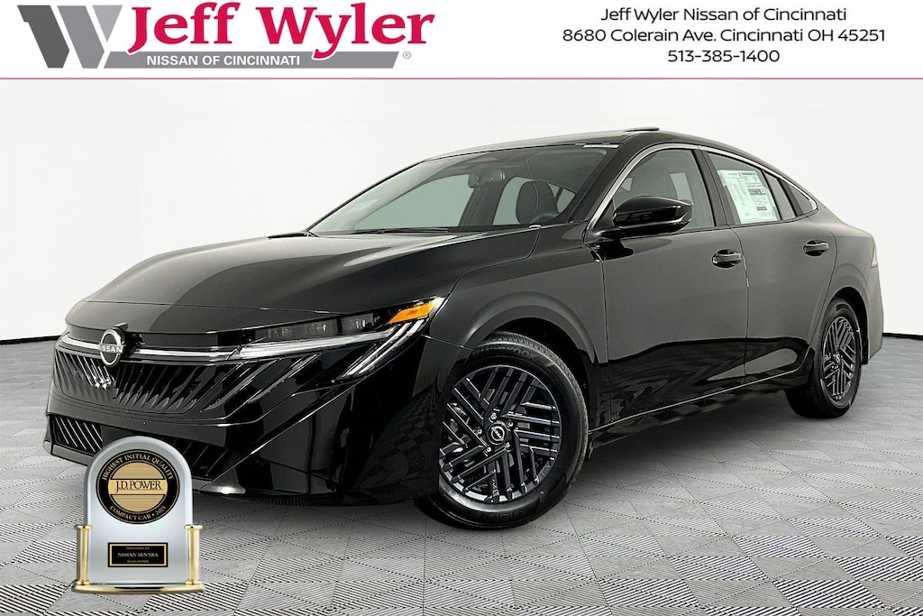 $2,045 off MSRP! Super Black 2026 Nissan Sentra SV FWD CVT with Xtronic Jeff Wyler Nissan of Cincinnati is honored to offer this attractive-looking 2026 Nissan Sentra SV in Super Black. Well equipped with: Floor Mat Package, SV Convenience Package (6 Speakers, Ambient Lighting, Auto Diming Inside Mirror, Heated Exterior Mirrors, Heated Front Seats, Heated Steering Wheel, I-Key with Approach Unlock All Plus Walk Away Lock, Soft Knee Pad, Synthetic Leather Steering Wheel, Visor DR/AS w/LED Light, and Wireless Charging For Personal Devices), SV Moonroof Package (Power Tilt Sliding Sunroof with Manual Sunshade), Trunk Package (Hide-A-Way Trunk Net), CVT with Xtronic, Charcoal Cloth, 16" Machined Alloy Wheels, 4 Speakers, 4-Wheel Disc Brakes, ABS brakes, Air Conditioning, Alloy wheels, AM/FM radio: Sirius, Auto High-beam Headlights, Automatic temperature control, Body Colored Splash Guards (4-Piece), Brake assist, Bumpers: body-color, Delay-off headlights, Driver door bin, Driver vanity mirror, Dual front impact airbags, Dual front side impact airbags, Electronic Stability Control, Four wheel independent suspension, Front anti-roll bar, Front Bucket Seats, Front Center Armrest, Front reading lights, Fully automatic headlights, Illuminated entry, Interior Door Scuff Protection, Knee airbag, Low tire pressure warning, Nissan USB Charging Cable Set, Occupant sensing airbag, Outside temperature display, Overhead airbag, Overhead console, Panic alarm, Passenger door bin, Passenger vanity mirror, Power door mirrors, Power steering, Power windows, Premium Cloth Seat Trim, Radio data system, Radio: AM/FM with RDS/MP3, Rear anti-roll bar, Rear side impact airbag, Rear window defroster, Remote keyless entry, Security system, Speed control, Speed-sensing steering, Split folding rear seat, Steering wheel mounted audio controls, Tachometer, Telescoping steering wheel, Tilt steering wheel, Traction control, Trip computer, Variably intermittent wipers, and Wireless Apple CarPlay/Wireless Android Auto. 2.0L I4 DOHC CVT with Xtronic, Charcoal Cloth.Recent Arrival! 30/38 City/Highway MPGWyler Family First Package Includes: NanoCure Appearance Protection: Exterior & Interior Chemical Sealant Applied to Protect Against Environmental Hazards (7 Year Warranty Coverage). Pulse- Rear end Collision Avoidance System Theft Deterrent Strategy gives you 5 Years of Coverage against vehicle Theft, Offering up to a $5,000 benefit. Price includes: $500 - Nissan Customer Cash. Exp. 05/04/2026 $500 - Nissan MWR April - 2026 Sentra Bonus Cash (Excluding S Trim). Exp. 04/30/2026