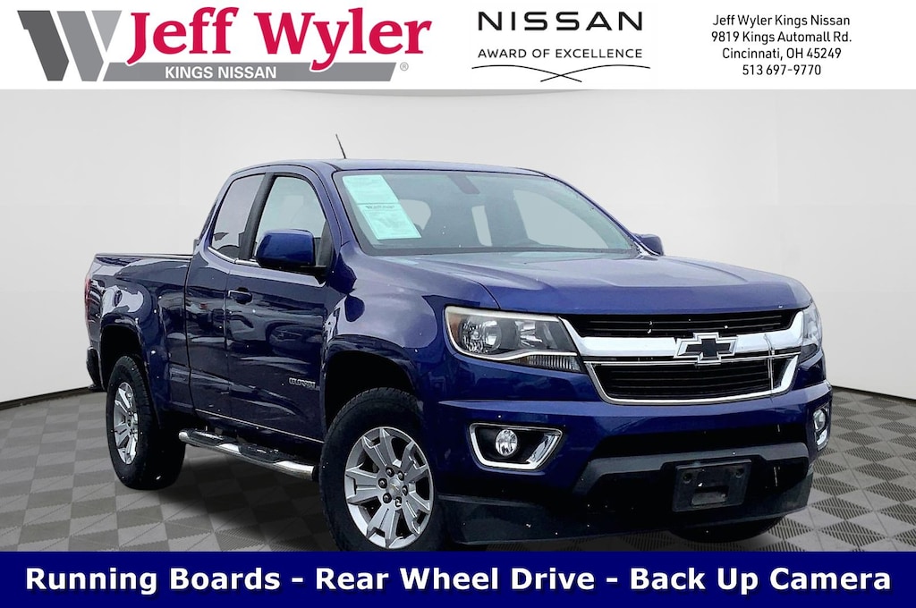 Jeff Wyler Kings Nissan is excited to offer this wonderful-looking 2016 Chevrolet Colorado LT in Laser Blue. Well equipped with: Black Bowtie Emblem Package (LPO), LT Convenience Package (EZ-Lift & Lower Tailgate, Front Fog Lamps, Manual Rear-Sliding Window, Rear-Window Electric Defogger, and Remote Vehicle Starter System), Preferred Equipment Group 2LT, 4-Wheel Disc Brakes, 4.10 Rear Axle Ratio, 6 Speakers, 6-Speaker Audio System Feature, ABS brakes, Air Conditioning, Alloy wheels, AM/FM radio: SiriusXM, Apple CarPlay, Bumpers: body-color, Cloth Seat Trim, Compass, Delay-off headlights, Driver 4-Way Power Seat Adjuster, Driver door bin, Driver vanity mirror, Dual front impact airbags, Dual front side impact airbags, Electronic Stability Control, Emergency communication system: OnStar Guidance, Exterior Parking Camera Rear, Front anti-roll bar, Front Bucket Seats, Front Center Armrest, Front License Plate Kit, Front reading lights, Front wheel independent suspension, Fully automatic headlights, Illuminated entry, Low tire pressure warning, Occupant sensing airbag, Outside temperature display, Overhead airbag, Overhead console, Panic alarm, Passenger door bin, Passenger vanity mirror, Power door mirrors, Power driver seat, Power steering, Power windows, Premium audio system: Chevrolet MyLink, Radio data system, Radio: AM/FM/SiriusXM w/Chevrolet MyLink, Rear step bumper, Remote keyless entry, Security system, SiriusXM Satellite Radio, Speed control, Speed-sensing steering, Split folding rear seat, Steering wheel mounted audio controls, Tachometer, Telescoping steering wheel, Tilt steering wheel, Traction control, Trip computer, Variably intermittent wipers, Wheel Locks, and Wheels: 17" x 8" Blade Silver Metallic Cast Alloy.Ask about available certifications.