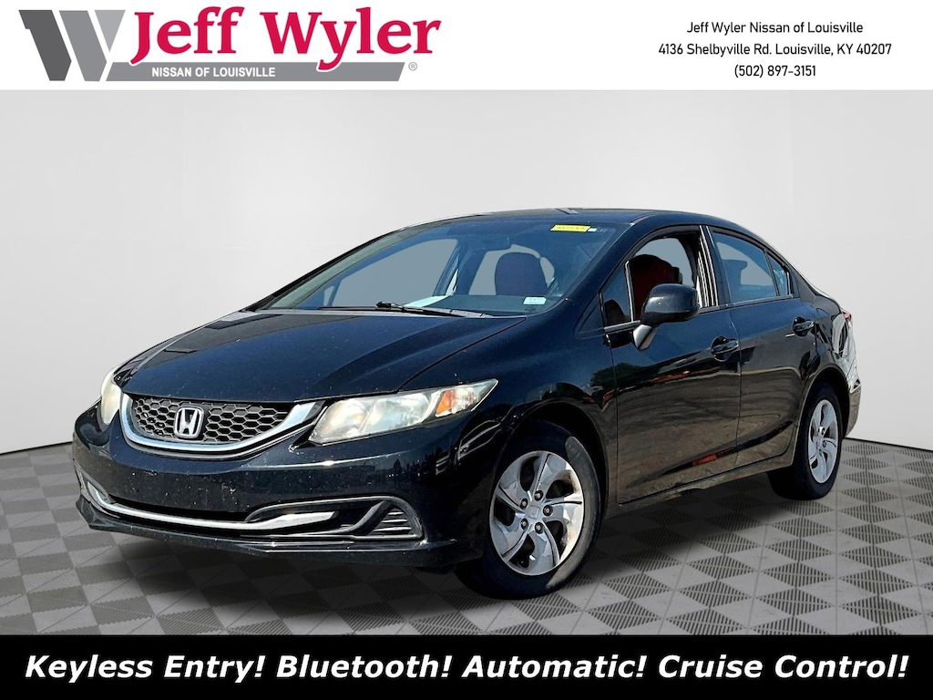 Jeff Wyler Nissan of Louisville is pumped up to offer this terrific-looking 2013 Honda Civic LX in Kona Coffee Metallic. ** BLUETOOTH **, ** BACKUP CAMERA **, ** GREAT FUEL ECONOMY **, ** EXCELLENT SERVICE HISTORY **, ** LOCALLY OWNED **, and ** HOME DELIVERY OPTIONS! ** Black w/Cloth Seat Trim, 15" Wheels w/Full Covers, 160-Watt AM/FM/CD Audio System, 4 Speakers, ABS brakes, Air Conditioning, AM/FM radio, Brake assist, Bumpers: body-color, CD player, Cloth Seat Trim, Delay-off headlights, Driver door bin, Driver vanity mirror, Dual front impact airbags, Dual front side impact airbags, Electronic Stability Control, Exterior Parking Camera Rear, Four wheel independent suspension, Front anti-roll bar, Front Bucket Seats, Front Center Armrest, Front reading lights, Illuminated entry, Low tire pressure warning, Occupant sensing airbag, Outside temperature display, Overhead airbag, Panic alarm, Passenger door bin, Passenger vanity mirror, Power door mirrors, Power steering, Power windows, Radio data system, Rear anti-roll bar, Rear window defroster, Reclining Front Bucket Seats, Remote keyless entry, Security system, Speed control, Speed-sensing steering, Steering wheel mounted audio controls, Tachometer, Telescoping steering wheel, Tilt steering wheel, Traction control, and Trip computer Our PRE-OWNED vehicles are put through a rigorous 167- POINT QUALITY ASSURANCE INSPECTION along with an average amount of over $1,400.00 SPENT to recondition each vehicle so we can be sure to deliver you the highest quality vehicle like you deserve! ***ONLINE PRICE DOES NOT INCLUDE WYLER FAMILY FIRST PACKAGE*** Stop by 4136 Shelbyville Road to see for yourself, or give us a call @ 502-897-3151 to schedule your test drive! ** BLUETOOTH **, ** BACKUP CAMERA **, ** GREAT FUEL ECONOMY **, ** EXCELLENT SERVICE HISTORY **, ** LOCALLY OWNED **, Black w/Cloth Seat Trim, 15" Wheels w/Full Covers, 160-Watt AM/FM/CD Audio System, 4 Speakers, ABS brakes, Air Conditioning, AM/FM radio, Brake assist, Bumpers: body-color, CD player, Cloth Seat Trim, Delay-off headlights, Driver door bin, Driver vanity mirror, Dual front impact airbags, Dual front side impact airbags, Electronic Stability Control, Exterior Parking Camera Rear, Four wheel independent suspension, Front anti-roll bar, Front Bucket Seats, Front Center Armrest, Front reading lights, Illuminated entry, Low tire pressure warning, Occupant sensing airbag, Outside temperature display, Overhead airbag, Panic alarm, Passenger door bin, Passenger vanity mirror, Power door mirrors, Power steering, Power windows, Radio data system, Rear anti-roll bar, Rear window defroster, Reclining Front Bucket Seats, Remote keyless entry, Security system, Speed control, Speed-sensing steering, Steering wheel mounted audio controls, Tachometer, Telescoping steering wheel, Tilt steering wheel, Traction control, Trip computer.