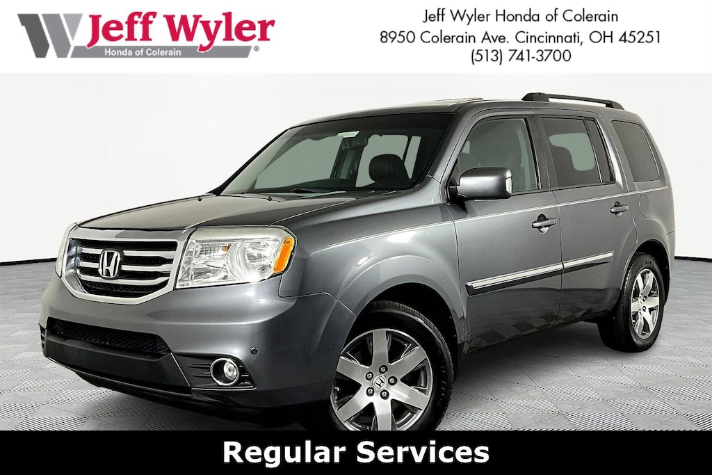 Jeff Wyler Honda of Colerain is delighted to offer this wonderful 2014 Honda Pilot Touring in . Well equipped with: 10 Speakers, 18" Alloy Wheels, 3rd row seats: split-bench, 4-Wheel Disc Brakes, 4.312 Axle Ratio, A/V remote, ABS brakes, Air Conditioning, Alloy wheels, AM/FM radio: XM, AM/FM/CD Premium Audio System, Anti-whiplash front head restraints, Auto-dimming Rear-View mirror, Automatic temperature control, Bodyside moldings, Brake assist, Bumpers: body-color, CD player, Compass, Delay-off headlights, Driver door bin, Driver vanity mirror, Dual front impact airbags, Dual front side impact airbags, Electronic Stability Control, Exterior Parking Camera Rear, Four wheel independent suspension, Front anti-roll bar, Front Bucket Seats, Front Center Armrest, Front dual zone A/C, Front fog lights, Front reading lights, Garage door transmitter: HomeLink, Headphones, Heated door mirrors, Heated Front Bucket Seats, Heated front seats, Illuminated entry, Leather Shift Knob, Leather-Trimmed Seat Trim, Low tire pressure warning, Memory seat, Navigation System, Occupant sensing airbag, Outside temperature display, Overhead airbag, Overhead console, Panic alarm, Passenger door bin, Passenger vanity mirror, Power door mirrors, Power driver seat, Power Liftgate, Power moonroof, Power passenger seat, Power steering, Power windows, Radio data system, Rear air conditioning, Rear anti-roll bar, Rear audio controls, Rear reading lights, Rear seat center armrest, Rear window defroster, Rear window wiper, Remote keyless entry, Roof rack: rails only, Security system, Speed control, Speed-sensing steering, Speed-Sensitive Wipers, Split folding rear seat, Steering wheel mounted audio controls, Tachometer, Telescoping steering wheel, Tilt steering wheel, Traction control, Trip computer, Turn signal indicator mirrors, Variably intermittent wipers, and XM Radio.