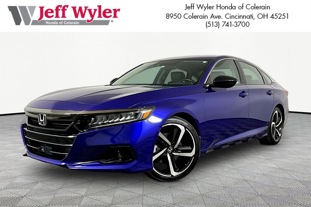 Jeff Wyler Honda of Colerain is excited to offer this good-looking 2022 Honda Accord Sport Special Edition in Blue. Well equipped with: 4-Wheel Disc Brakes, 8 Speakers, ABS brakes, Adaptive Cruise Control: Adaptive Cruise Control (ACC) with Low-Speed Follow, Air Conditioning, Alloy wheels, AM/FM radio, Apple CarPlay/Android Auto, Auto High-beam Headlights, Automatic temperature control, Brake assist, Bumpers: body-color, Delay-off headlights, Driver door bin, Driver vanity mirror, Dual front impact airbags, Dual front side impact airbags, Electronic Stability Control, Emergency communication system: HondaLink, Exterior Parking Camera Rear, Forward collision: Collision Mitigation Braking System (CMBS) + FCW mitigation, Four wheel independent suspension, Front anti-roll bar, Front Bucket Seats, Front Center Armrest, Front dual zone A/C, Front fog lights, Front reading lights, Fully automatic headlights, Heated door mirrors, Heated Front Bucket Seats, Heated front seats, Illuminated entry, Knee airbag, Lane Departure Warning System, Leather Shift Knob, Leather steering wheel, Low tire pressure warning, Occupant sensing airbag, Outside temperature display, Overhead airbag, Overhead console, Panic alarm, Passenger door bin, Passenger vanity mirror, Perforated Leather Seat Trim, Power door mirrors, Power driver seat, Power passenger seat, Power steering, Power windows, Radio data system, Radio: 180-Watt AM/FM Audio System, Rear anti-roll bar, Rear seat center armrest, Rear window defroster, Remote keyless entry, Security system, Speed control, Speed-sensing steering, Speed-Sensitive Wipers, Split folding rear seat, Spoiler, Steering wheel mounted audio controls, Tachometer, Telescoping steering wheel, Tilt steering wheel, Traction control, Trip computer, Variably intermittent wipers, and Wheels: 19" Machine-Finished Alloy w/Black Inserts.