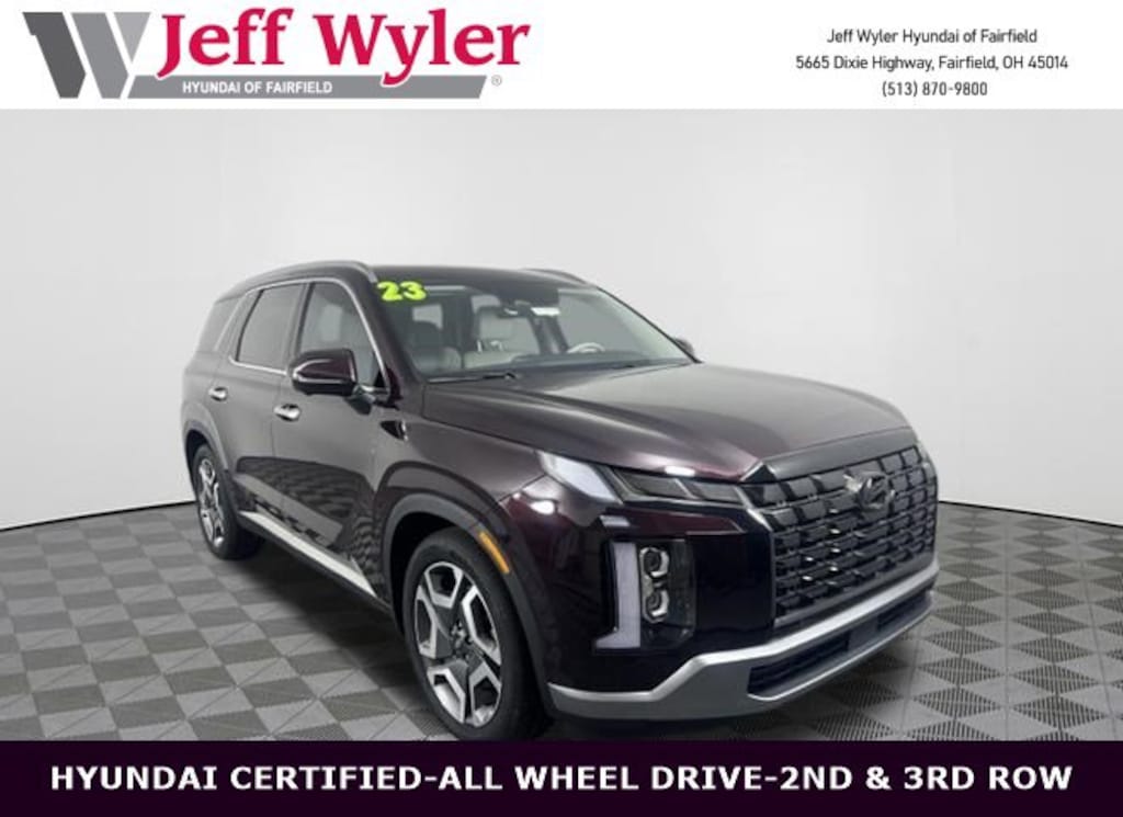 CARFAX One-Owner. Jeff Wyler Hyundai of Fairfield is pleased to offer this great 2023 Hyundai Palisade Limited in Sierra Burgundy. Well equipped with: Option Group 01, Android Auto, Apple CarPlay, CALL NOW FOR YOUR VIP APPOINTMENT 513-870-9800, FULLY SERVICED w/RECORDS, GUARANTEED FINANCING!! NO MATTER YOUR SITUATION WE CAN GET AN APPROVAL!!, THE #1 Volume dealer in the region! Come see why for yourself Today!!, WE PAY MORE FOR YOUR TRADE!!, 12 Speakers, 3.648 Axle Ratio, 3rd row seats: split-bench, 4-Wheel Disc Brakes, ABS brakes, Air Conditioning, Alloy wheels, AM/FM radio: SiriusXM, Apple CarPlay & Android Auto, Auto High-beam Headlights, Auto-dimming door mirrors, Auto-dimming Rear-View mirror, Auto-leveling suspension, Automatic temperature control, Brake assist, Bumpers: body-color, Cargo Net, Carpeted Floor Mats, Compass, Delay-off headlights, Driver door bin, Driver vanity mirror, Dual front impact airbags, Dual front side impact airbags, Electronic Stability Control, Emergency communication system: Blue Link Connected Car Service (3-year complimentary subscription), Exterior Parking Camera Rear, Four wheel independent suspension, Front anti-roll bar, Front Bucket Seats, Front Center Armrest, Front dual zone A/C, Front reading lights, Fully automatic headlights, Garage door transmitter: HomeLink, harman/kardon® Speakers, Heads-Up Display, Heated & Ventilated Front Bucket Seats, Heated door mirrors, Heated front seats, Heated rear seats, Heated steering wheel, Illuminated entry, Knee airbag, Leather Seat Trim, Low tire pressure warning, Memory seat, Navigation System, Occupant sensing airbag, Outside temperature display, Overhead airbag, Overhead console, Panic alarm, Passenger door bin, Passenger vanity mirror, Power door mirrors, Power driver seat, Power Liftgate, Power moonroof, Power passenger seat, Power steering, Power windows, Radio data system, Radio: AM/FM/MP3 Premium Audio System, Rain sensing wipers, Rear air conditioning, Rear anti-roll bar, Rear audio controls, Rear reading lights, Rear side impact airbag, Rear window defroster, Rear window wiper, Reclining 3rd row seat, Remote keyless entry, Security system, Speed control, Speed-sensing steering, Splash Trim, Split folding rear seat, Spoiler, Steering wheel mounted audio controls, Tachometer, Telescoping steering wheel, Tilt steering wheel, Traction control, Trip computer, Turn signal indicator mirrors, Variably intermittent wipers, Ventilated front seats, Ventilated rear seats, Wheel Locks, and Wheels: 20" x 7.5J Alloy. TO CHECK ON THE AVAILABILITY OF THIS VEHICLE REACH OUT TO ONE OF OUR TEAM MEMBERS!! ALSO SHOP ONLINE AT https://www.jeffwylerhyundaioffairfield.com/ Proudly Serving: Cincinnati, Dayton, Columbus, Louisville, Lexington, Indianapolis, Hamilton, Florence, Alexandria, Beavercreek, Springdale, West Chester, Monroe, Fairfield, Kenwood, Newport and all of greater Cincinnati Ohio, Indiana, and Northern Kentucky.