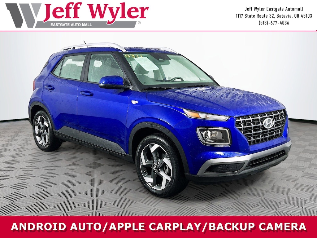 Jeff Wyler Eastgate Auto Mall is honored to offer this gorgeous-looking 2025 Hyundai Venue SEL in Intense Blue. Well equipped with: Option Group 01, 4-Wheel Disc Brakes, 6 Speakers, 6.5J x 17" Alloy Wheels, ABS brakes, Air Conditioning, Alloy wheels, AM/FM radio, Apple CarPlay & Android Auto, Auto High-beam Headlights, Automatic temperature control, Brake assist, Bumpers: body-color, Cargo Net, Carpeted Floor Mats, Cloth Seat Trim, Delay-off headlights, Driver door bin, Driver vanity mirror, Dual front impact airbags, Dual front side impact airbags, Electronic Stability Control, First Aid Kit, Front anti-roll bar, Front Bucket Seats, Front Center Armrest, Front reading lights, Front wheel independent suspension, Fully automatic headlights, Illuminated entry, Leather Shift Knob, Leather steering wheel, Low tire pressure warning, Occupant sensing airbag, Outside temperature display, Overhead airbag, Overhead console, Panic alarm, Passenger door bin, Passenger vanity mirror, Power door mirrors, Power moonroof, Power steering, Power windows, Radio: AM/FM/HD Display Audio, Rear Bumper Applique, Rear Seat Cup Holder, Rear window defroster, Rear window wiper, Remote keyless entry, Reversible Cargo Tray, Security system, Speed control, Speed-sensing steering, Split folding rear seat, Spoiler, Steering wheel mounted audio controls, Tachometer, Telescoping steering wheel, Tilt steering wheel, Traction control, Trip computer, Variably intermittent wipers, and Wheel Locks. CARFAX One-Owner. Clean CARFAX. Ask about available certifications. Used vehicles 10 years of age or newer with less than 100,000 miles are eligible for the Wyler Assurance Program, but eligible vehicles must pass our reconditioning process and multi-point inspection. Provided the vehicle passes inspection, vehicles will be eligible for the 6 month/6,000 mile limited warranty. The 6 month/6,000 mile limited warranty is NOT available on AS-IS vehicles, wholesale vehicles, lease buyback/pass-thru vehicles or un-inspected vehicles. Note that this program can also apply to vehicles where the remaining factory coverage is less than 6 months or 6,000 miles. Please check the Federal Trade Commission (FTC) Buyers guide on the vehicle for full details as to whether or not warranty coverage may apply. Contact Dealer for additional details. The Wyler Assurance 6 month/6,000 Mile limited warranty ends 6 months from the date of the Retail Purchase Agreement (BUYERS ORDER) or when the vehicle's odometer registers 6,000 additional miles to the mileage listed on the BUYERS ORDER, whichever comes first. Your Deductible - The warranty holder on your contract pays the first $100 of each covered repair.