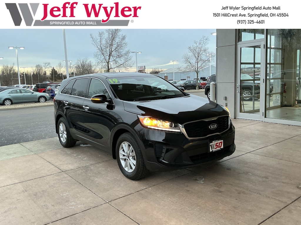 Jeff Wyler Springfield Auto Mall is pleased to offer this terrific-looking 2019 Kia Sorento LX in Ebony Black. Well equipped with: 17" x 7.0" Alloy Wheels, 3.51 Axle Ratio, 3rd row seats: split-bench, 4-Wheel Disc Brakes, 6 Speakers, ABS brakes, Air Conditioning, Alloy wheels, AM/FM radio, Apple CarPlay & Android Auto, Brake assist, Bumpers: body-color, Cargo Net (Envelope), Carpeted Floor Mats (7-Passenger), Delay-off headlights, Driver door bin, Driver vanity mirror, Dual front impact airbags, Dual front side impact airbags, Electronic Stability Control, Exterior Parking Camera Rear, Four wheel independent suspension, Front anti-roll bar, Front Bucket Seats, Front Center Armrest, Front reading lights, Fully automatic headlights, Heated door mirrors, Illuminated entry, Low tire pressure warning, Mudguards, Occupant sensing airbag, Outside temperature display, Overhead airbag, Overhead console, Panic alarm, Passenger door bin, Passenger vanity mirror, Power door mirrors, Power steering, Power windows, Radio data system, Radio: UVO Play w/AM/FM/MP3, Rear anti-roll bar, Rear seat center armrest, Rear window defroster, Rear window wiper, Remote keyless entry, Security system, Speed control, Speed-sensing steering, Split folding rear seat, Spoiler, Steering wheel mounted audio controls, Tachometer, Telescoping steering wheel, Tilt steering wheel, Traction control, Trip computer, Turn signal indicator mirrors, Variably intermittent wipers, and YES Essentials Cloth Seat Trim. Ask about available certifications. Used vehicles 10 years of age or newer with less than 100,000 miles are eligible for the Wyler Assurance Program, but eligible vehicles must pass our reconditioning process and multi-point inspection. Provided the vehicle passes inspection, vehicles will be eligible for the 6 month/6,000 mile limited warranty. The 6 month/6,000 mile limited warranty is NOT available on AS-IS vehicles, wholesale vehicles, lease buyback/pass-thru vehicles or un-inspected vehicles. Note that this program can also apply to vehicles where the remaining factory coverage is less than 6 months or 6,000 miles. Please check the Federal Trade Commission (FTC) Buyers guide on the vehicle for full details as to whether or not warranty coverage may apply. Contact Dealer for additional details. The Wyler Assurance 6 month/6,000 Mile limited warranty ends 6 months from the date of the Retail Purchase Agreement (BUYERS ORDER) or when the vehicle's odometer registers 6,000 additional miles to the mileage listed on the BUYERS ORDER, whichever comes first. Your Deductible - The warranty holder on your contract pays the first $100 of each covered repair.