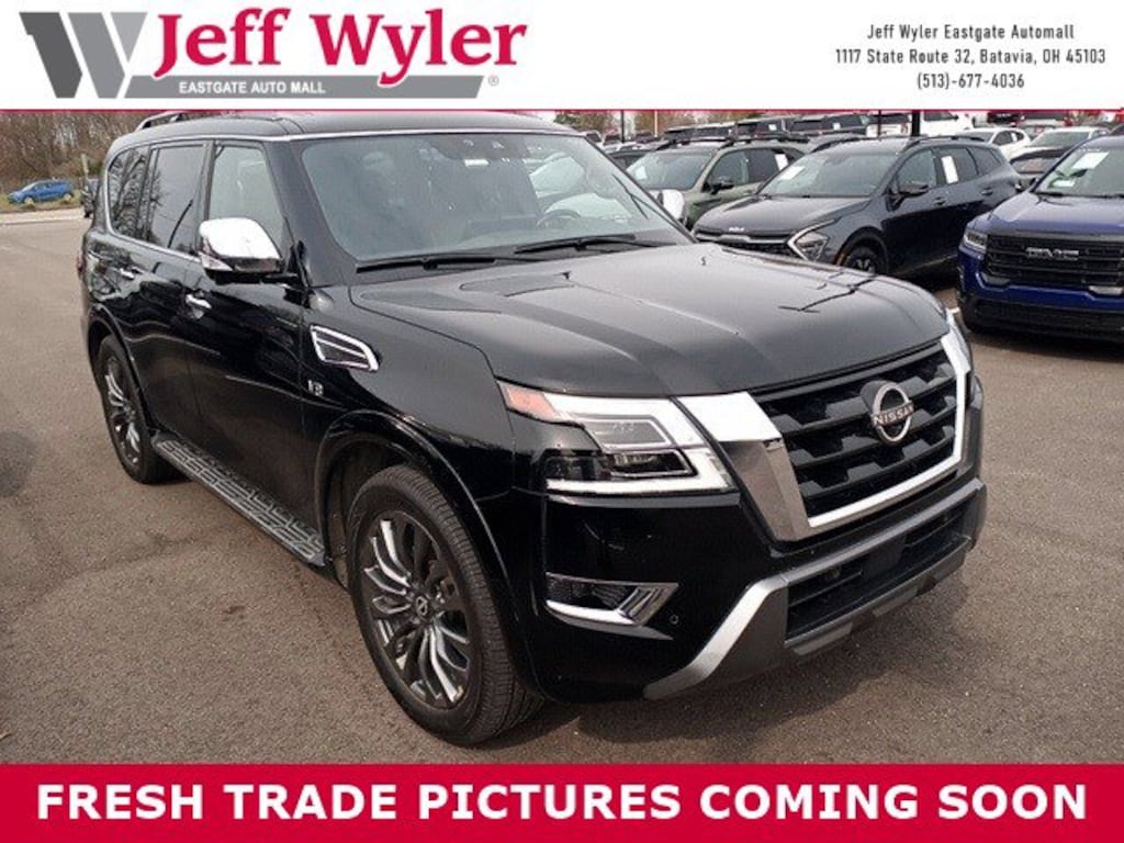 Jeff Wyler Eastgate Auto Mall is proud to offer this gorgeous-looking 2021 Nissan Armada Platinum in Super Black. Well equipped with: 13 Speakers, 2.94 Axle Ratio, 3rd Row Carpeted Floor Mats - Bench Seat, 3rd row seats: split-bench, 4-Wheel Disc Brakes, A/V remote, ABS brakes, Air Conditioning, Alloy wheels, AM/FM radio: SiriusXM, Anti-whiplash front head restraints, Auto High-beam Headlights, Auto tilt-away steering wheel, Auto-dimming door mirrors, Auto-dimming Rear-View mirror, Auto-leveling suspension, Automatic temperature control, Brake assist, Bumpers: body-color, Climate-Controlled Front Bucket Seats, Cross Bars, Delay-off headlights, Driver door bin, Driver vanity mirror, Dual front impact airbags, Dual front side impact airbags, Electronic Stability Control, Emergency communication system: NissanConnect Services, Exterior Parking Camera Rear, Four wheel independent suspension, Front anti-roll bar, Front Bucket Seats, Front Center Armrest, Front dual zone A/C, Front fog lights, Front reading lights, Fully automatic headlights, Garage door transmitter: HomeLink, Headphones, Heated door mirrors, Heated front seats, Heated rear seats, Heated steering wheel, Illuminated entry, Leather Shift Knob, Low tire pressure warning, Memory seat, Navigation System, NissanConnect featuring Apple CarPlay and Android Auto, Occupant sensing airbag, Outside temperature display, Overhead airbag, Overhead console, Panic alarm, Passenger door bin, Passenger vanity mirror, Power door mirrors, Power driver seat, Power Liftgate, Power moonroof, Power passenger seat, Power steering, Power windows, Quilted Leather Seat Trim, Radio: NissanConnect w/SiriusXM, Rain sensing wipers, Rear air conditioning, Rear anti-roll bar, Rear reading lights, Rear seat center armrest, Rear window defroster, Rear window wiper, Reclining 3rd row seat, Remote keyless entry, Security system, Speed control, Speed-sensing steering, Speed-Sensitive Wipers, Split folding rear seat, Spoiler, Steering wheel memory, Steering wheel mounted audio controls, Tachometer, Telescoping steering wheel, Tilt steering wheel, Traction control, Trip computer, Turn signal indicator mirrors, Variably intermittent wipers, Ventilated front seats, Voltmeter, and Wheels: 22" Machine-Faced w/Tinted Clear Coat. Clean CARFAX. Ask about available certifications. Used vehicles 10 years of age or newer with less than 100,000 miles are eligible for the Wyler Assurance Program, but eligible vehicles must pass our reconditioning process and multi-point inspection. Provided the vehicle passes inspection, vehicles will be eligible for the 6 month/6,000 mile limited warranty. The 6 month/6,000 mile limited warranty is NOT available on AS-IS vehicles, wholesale vehicles, lease buyback/pass-thru vehicles or un-inspected vehicles. Note that this program can also apply to vehicles where the remaining factory coverage is less than 6 months or 6,000 miles. Please check the Federal Trade Commission (FTC) Buyers guide on the vehicle for full details as to whether or not warranty coverage may apply. Contact Dealer for additional details. The Wyler Assurance 6 month/6,000 Mile limited warranty ends 6 months from the date of the Retail Purchase Agreement (BUYERS ORDER) or when the vehicle's odometer registers 6,000 additional miles to the mileage listed on the BUYERS ORDER, whichever comes first. Your Deductible - The warranty holder on your contract pays the first $100 of each covered repair.