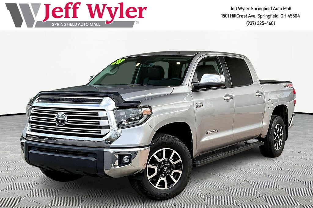 Jeff Wyler Springfield Auto Mall is delighted to offer this gorgeous 2020 Toyota Tundra Limited in Silver. Well equipped with: 4-Wheel Disc Brakes, 4.30 Axle Ratio, 9 Speakers, ABS brakes, Air Conditioning, Alloy wheels, AM/FM radio: SiriusXM, Anti-Theft Immobilizer w/Alarm, Apple CarPlay/Android Auto, Auto High-beam Headlights, Auto-dimming Rear-View mirror, Automatic temperature control, Brake assist, Compass, Delay-off headlights, Driver door bin, Driver vanity mirror, Dual front impact airbags, Dual front side impact airbags, Electronic Stability Control, Emergency communication system: Safety Connect with 1-year trial, Exterior Parking Camera Rear, Front anti-roll bar, Front Bucket Seats, Front Center Armrest, Front dual zone A/C, Front fog lights, Front reading lights, Front wheel independent suspension, Fully automatic headlights, Garage door transmitter: HomeLink, Heated door mirrors, Heated Front Bucket Seats, Heated front seats, Illuminated entry, Knee airbag, Leather Seat Trim (LB), Low tire pressure warning, Navigation System, Occupant sensing airbag, Outside temperature display, Overhead airbag, Overhead console, Panic alarm, Passenger door bin, Passenger vanity mirror, Power door mirrors, Power driver seat, Power passenger seat, Power steering, Power Tilt & Slide Moonroof w/Sliding Sunshade, Power windows, Power Windows w/Front Auto Up/Down, Radio data system, Radio: Premium Audio w/Dynamic Navigation, Radio: Premium JBL Audio w/Dynamic Navigation, Rear reading lights, Rear seat center armrest, Rear step bumper, Rear window defroster, Remote Connect, Remote keyless entry, Safety Connect, Security system, Service Connect, SiriusXM Radio, Speed control, Speed-sensing steering, Split folding rear seat, Steering wheel mounted audio controls, Tachometer, Telescoping steering wheel, Tilt steering wheel, Traction control, Trip computer, Variably intermittent wipers, Voltmeter, and Wheels: 20" Split 5-Spoke Machined Alloy. Awards: * JD Power Initial Quality Study (IQS), Vehicle Dependability Study * JD Power Vehicle Dependability Study * JD Power Initial Quality Study (IQS) Ask about available certifications. Used vehicles 10 years of age or newer with less than 100,000 miles are eligible for the Wyler Assurance Program, but eligible vehicles must pass our reconditioning process and multi-point inspection. Provided the vehicle passes inspection, vehicles will be eligible for the 6 month/6,000 mile limited warranty. The 6 month/6,000 mile limited warranty is NOT available on AS-IS vehicles, wholesale vehicles, lease buyback/pass-thru vehicles or un-inspected vehicles. Note that this program can also apply to vehicles where the remaining factory coverage is less than 6 months or 6,000 miles. Please check the Federal Trade Commission (FTC) Buyers guide on the vehicle for full details as to whether or not warranty coverage may apply. Contact Dealer for additional details. The Wyler Assurance 6 month/6,000 Mile limited warranty ends 6 months from the date of the Retail Purchase Agreement (BUYERS ORDER) or when the vehicle's odometer registers 6,000 additional miles to the mileage listed on the BUYERS ORDER, whichever comes first. Your Deductible - The warranty holder on your contract pays the first $100 of each covered repair.